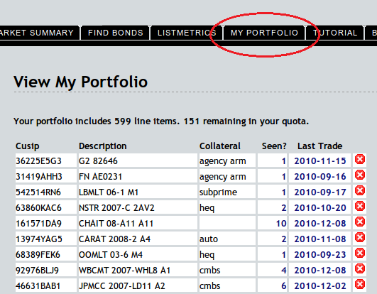 Dec. 16, 2010Now it’s even easier to keep track of the bonds you care about. Click on the navigation bar’s My Portfolio tab and copy in some cusips. The number of trades on record and last trade date appear with links to recent list activity. All columns are sortable by clicking on the header.