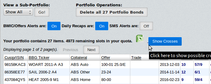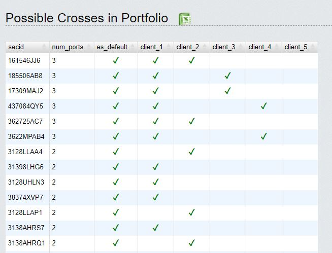 Feb. 29, 2016Our customers often load up client portfolios to their watch lists to find some easy trades off of BWIC matchers or offer sheet matchers. Now you can cross-link sub-portfolios to one another to find trade opportunities among your client base with the Cross Finder feature. Many institutions have such matching tools at the group level, and some enterprise vendors charge large fees to install such products, but Empirasign now puts this power in your hands at the click of a mouse. Hat tip to Alex K for suggesting this product enhancement to us. See below for an example demonstration of the Cross Finder feature, which can be found on your portfolio page.