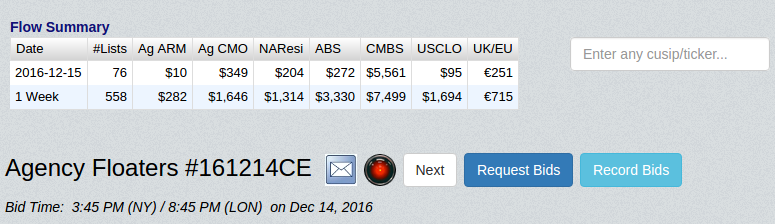 On any current BWIC page you can now request a bid from your counterparty contacts or record one on their behalf. See screenshot below of the appropriate buttons. If you do not see these buttons, please contact your Empirasign representative to be enabled.