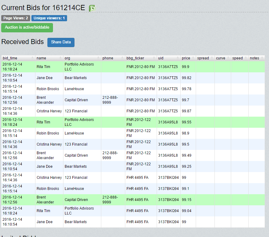 If you choose to record bids on a contact's behalf, you will be directed to a web form to do so. If you request bids directly from a client, they will be sent a link to a similar web form. Your counterparty contacts do not need to be Empirasign customers to record data via these forms. A screenshot of the results of such data entries is shown below.