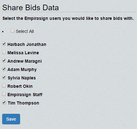 All the data you or your colleagues collect via Bid Collector or Empirasign MyData (refresher below) can be shared at your discretion among your colleagues. Data sharing allows a whole team to amortize or allocate the tedious process of recording market observations. Example data sharing screenshot below.