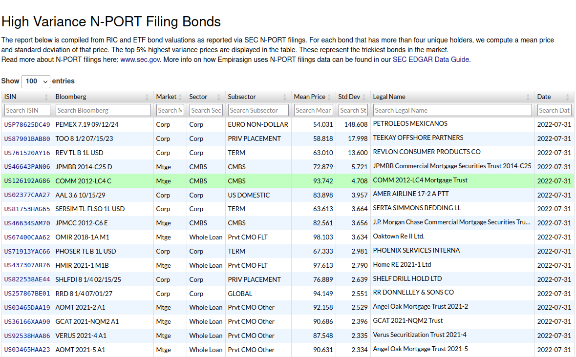 Where there's uncertainty, there's opportunity. By virtue of public reporting methods, investors have declared these bonds cannot be valued with a high level of precision. The High Variance Marks report brings these opportunities front and center. Furthermore, this report can help you solve your own vexing valuations issues. If you disagree with a counterparty or an auditor on a mark, feel free to consult this report. If your disagreement is 2 points, but the public standard deviation for this bond's mark is 4 points, do you really have a disagreement?