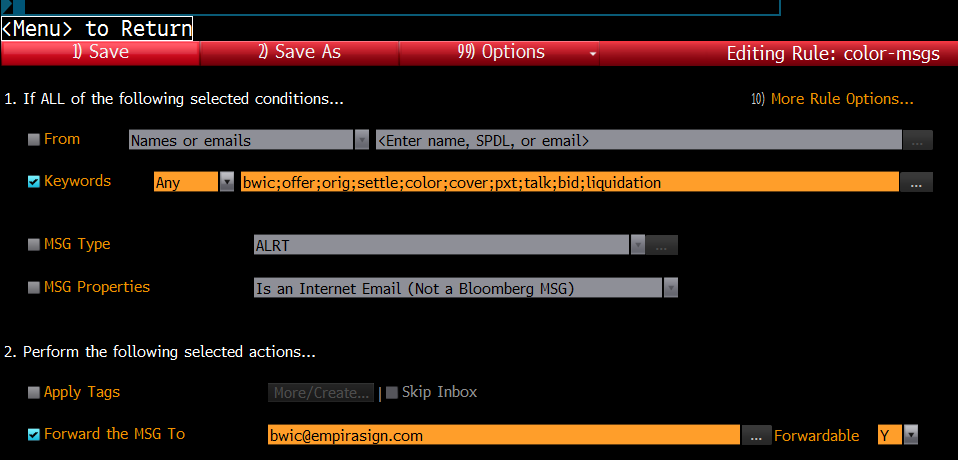 [email protected]in the box to the right of Forward the MSG To. You can also enter the alias[email protected]if you don't want doubled-up search results when searching your Bloomberg inbox for the termbwic. - Click 2) Save As or hit 2